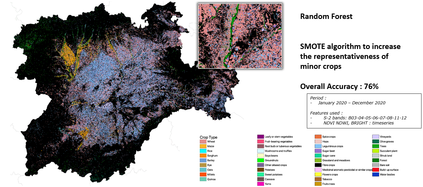 A highly accurate crop type map have been produced on Castilla y Leon region based on the training data presented above. The SMOTE algorithm was also applied to ensure that minor crops were accurately represented in the map. The resulting crop type map has an overall accuracy of 76% and covers the period of January 2020 to December 2020. With 28 crop classes represented in the map, this highly accurate and detailed tool provides valuable insights into Spain's agricultural sector and can inform a range of decisions in the field.